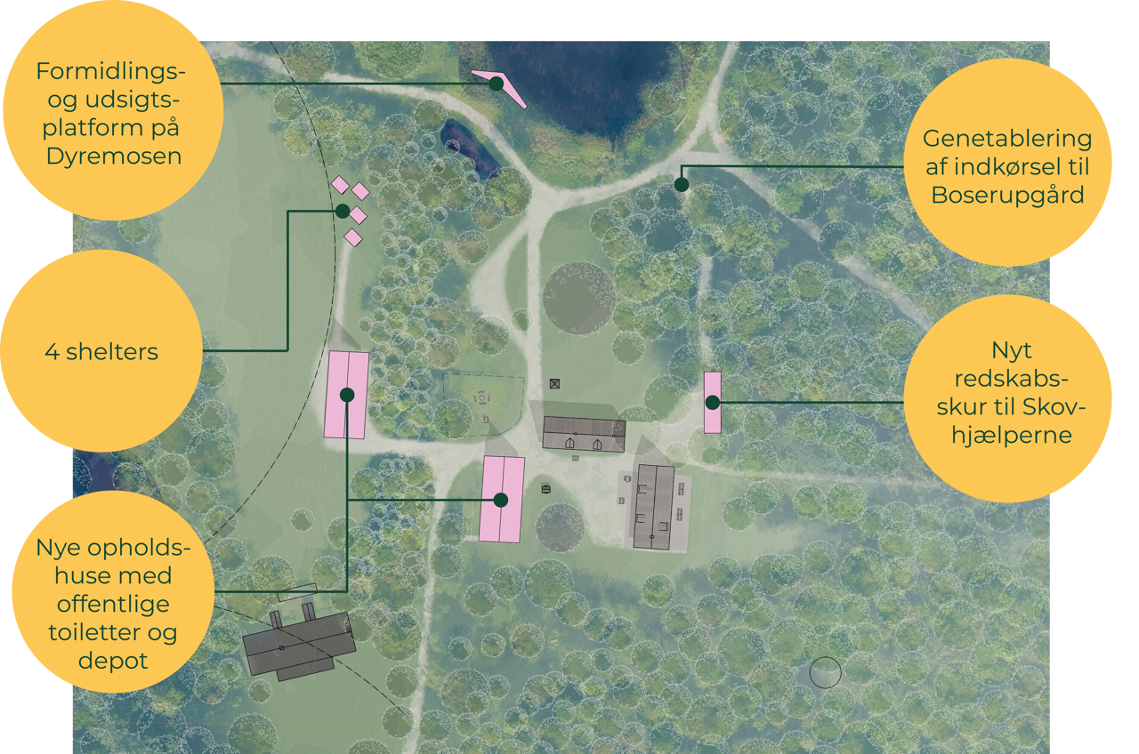 I de kommende år forbedrer vi faciliteterne på Boserupgård med to nye opholdshuse, fire shelters, udsigtsplatform på Dyremosen, nyt redskabsskur til Skovhjælperne og en ekstra indkørsel til Boserupgård.