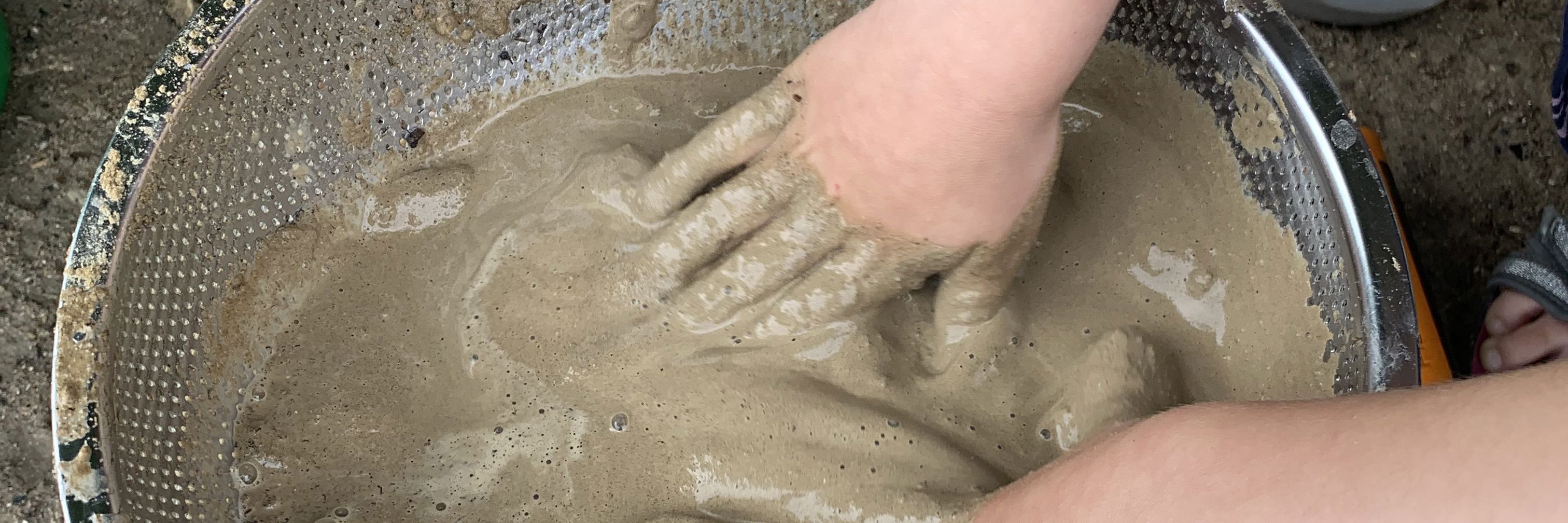 Børnene undersøger jord og sand nærmere, bygger mudderskulpturer og eksperimenterer med at sigte materialer og hælde vand på dem