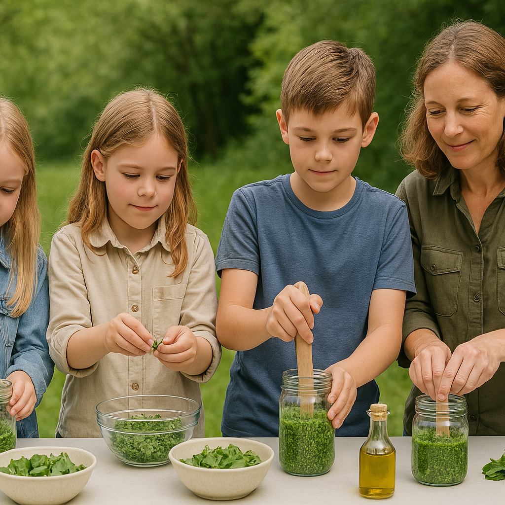 [N/T]+[MAD] Klassen tager på en sanketur for at indsamle planter som løgkarse, skvalderkål og ramsløg. Efter hjemkomst produceres 3 forskelige pestoer af de indsamlede planter. Eleverne udforsker forskellen i smagen af de forskellige pestoer.